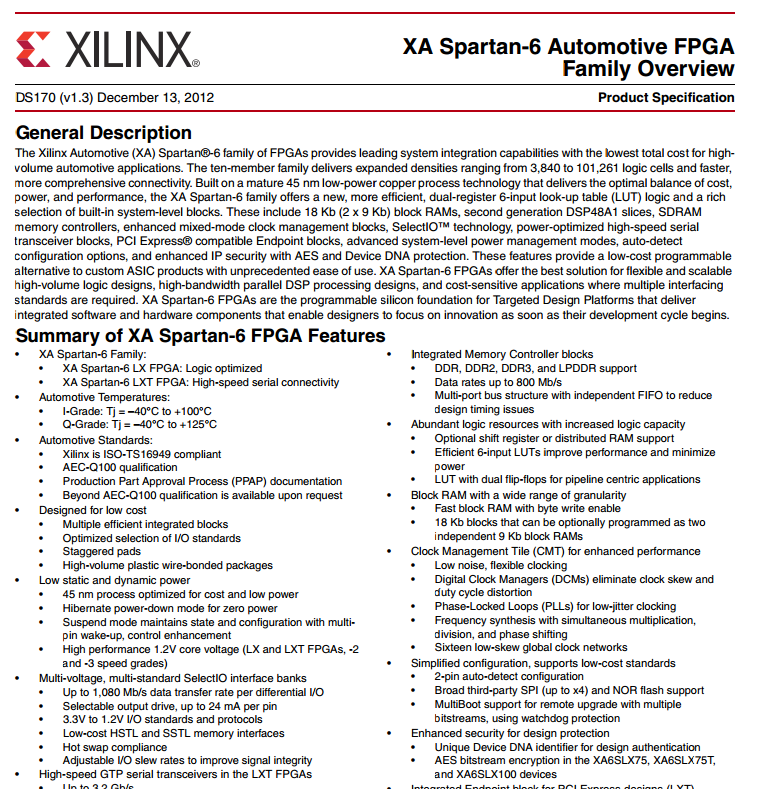 Xilinx 汽車(XA) Spartan-6 FPGA 系列是 Xilinx 推出的最新一代汽車級器件,基于商用 Spartan-6 FPGA 系列。XA Spartan-6 FGPA 利用公認的低功耗 45nm、9 金屬銅層、雙重氧化處理技術制造而成,符合嚴格的汽車器件級要求。