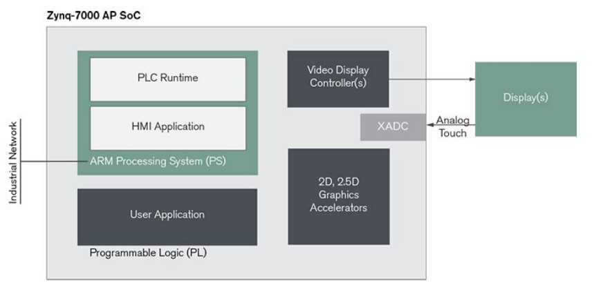 Xilinx FPGA 和 AP SoC 在整個工業自動化系統中應用,添加了智能、靈活性和高精度控制功能。利用 Xilinx 的高性能圖形解決方案,設計人員可方便地為高度集成的控制器設計添加尖端 HMI,而且不會增加額外的芯片。利用從觸摸屏捕獲模擬輸入的片上 ADC,我們可進一步提高集成度,不再需要外部 ADC。