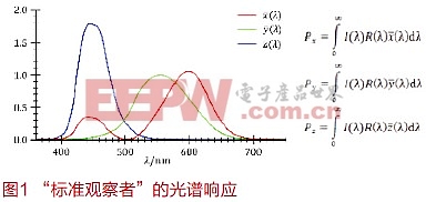。這三個(gè)函數(shù)可視為三個(gè)線性光檢測(cè)器的光譜敏感度曲線。三個(gè)線性光檢測(cè)器可產(chǎn)生CIE XYZ三色激勵(lì)值Px、Py和Pz,這三個(gè)值也被統(tǒng)稱(chēng)為CIE標(biāo)準(zhǔn)觀察者。
