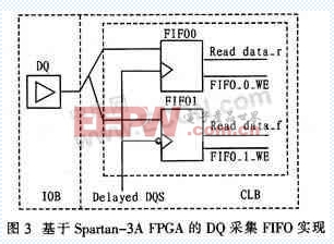 讀 寫數(shù)據(jù)接口模 塊是整個(gè)控制器設(shè)計(jì)的關(guān)鍵,它負(fù)責(zé)將用戶寫入的數(shù)據(jù)DQ和DOS按照DDR2SDRAM時(shí)序要求發(fā)送給DDR2,DDR2在DQS的每一個(gè)時(shí)鐘沿采集寫數(shù) 據(jù)。在讀取數(shù)據(jù)時(shí),DDR2SDRAM將DQS和相關(guān)數(shù)據(jù)發(fā)送到與DQ對(duì)齊邊沿的FPGA。FPGA將接收到的DQS信號(hào)經(jīng)過(guò)延遲校準(zhǔn),作為內(nèi)部存儲(chǔ)讀數(shù) 據(jù)的FIFO的寫時(shí)鐘。FPGA為DDR2的每個(gè)數(shù)據(jù)位配置一對(duì)讀寫異步的FIFO,每個(gè)數(shù)據(jù)位都輸入到上升沿(FIFO0)和下降沿(FIFO1)的 FIFO中,實(shí)現(xiàn)原理如圖3所示。
