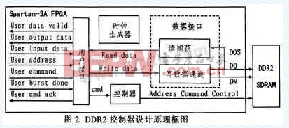 基于FPGA的DDR2控制器設(shè)計(jì)是由時(shí)鐘生成模塊、存儲(chǔ)控制模塊和讀寫數(shù)據(jù)接口模塊組成如圖2所示。
