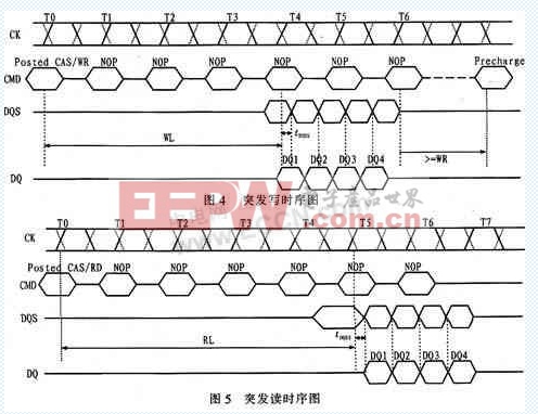 出,讀取時(shí)由DDR2產(chǎn)生DQS向控制器發(fā)送,它與讀數(shù)據(jù)邊沿對(duì)齊而與寫數(shù)據(jù)中心對(duì)齊。DN為數(shù)據(jù)信號(hào)屏蔽位在突發(fā)寫傳輸時(shí)屏蔽不存儲(chǔ)的數(shù)