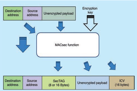 圖3 – MACsec幀結(jié)構(gòu)包括MAC安全標簽(SecTAG)字段,其可定義EtherType,并標明數(shù)據(jù)包是否加密。