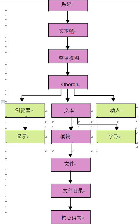 名為“Oberon”的模塊是中心任務調度程序,而“System”是基礎命令模塊。通過點擊顯示器上任何瀏覽器文本“M.P”上的中間按鈕即可觸發動作,其中P是模塊M聲明的程序名。如果M不存在,則會自動加載。但是,大多數文本編輯命令是通過簡單的鼠標點擊觸發的。